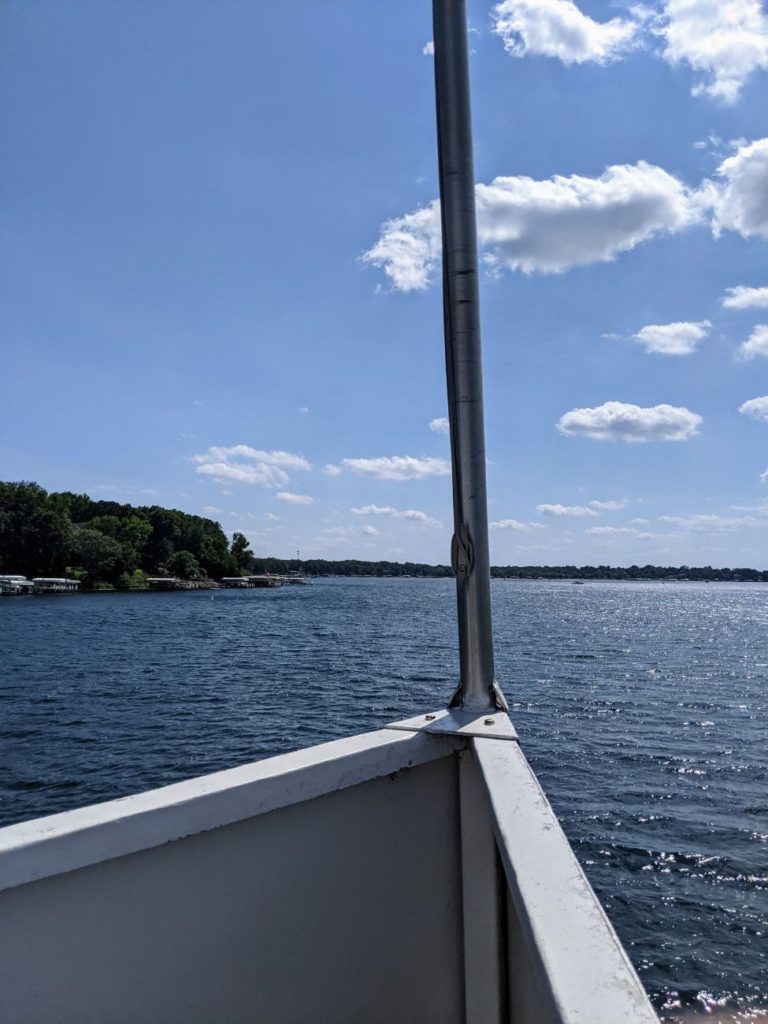 An excursion on the Queen II lasts about 45 minutes or so. A pre-recorded narration details the history of the lake & the town. You can hear the narration best in the seated areas, but the best view is from the bow, where it’s too windy to hear it well. I ended up compromising by standing against the pilothouse where there is a speaker.