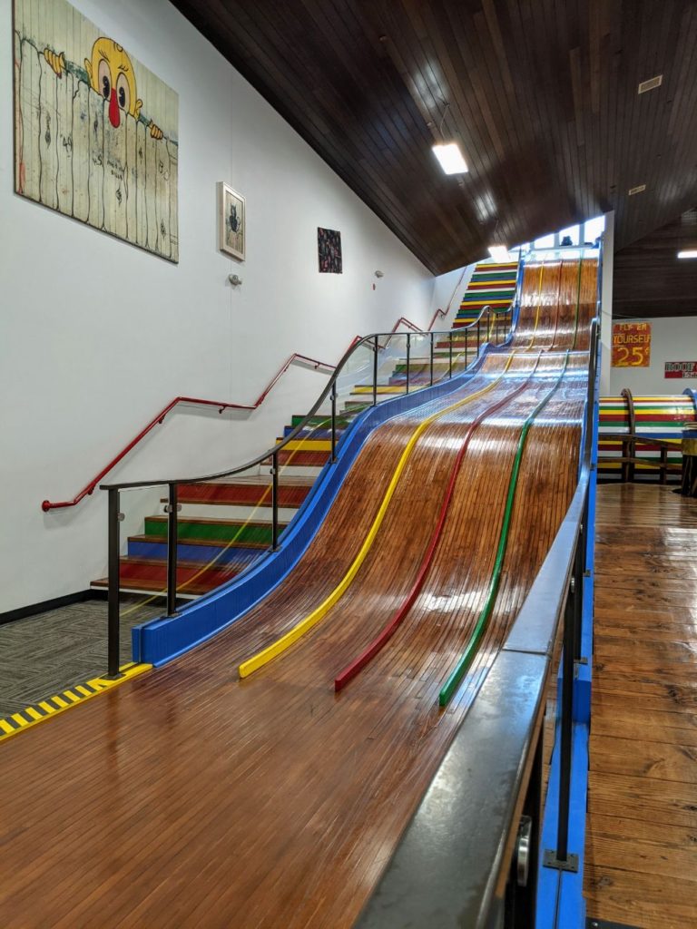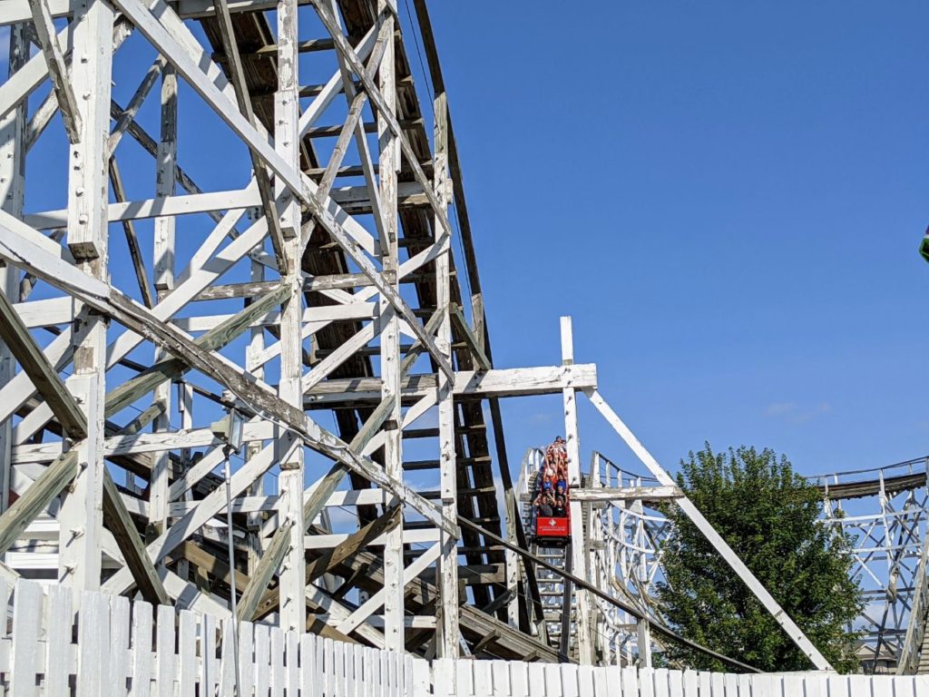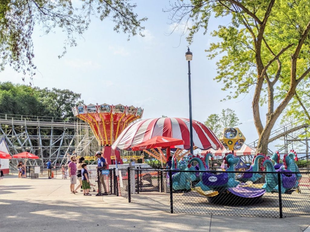 There is another roller coaster, a Wild Mouse relocated from another park, and a kiddie coaster. Otherwise, we have a Log Flume, Tilt-A-Whirl, Octopus, and a small Ferris wheel. There is a fun Mirror Maze and Tipsy House, which you don’t see often, and a Rock-O-Plane and Roll-O-Plane historic rides. I’ve never ridden these – they seem like kid’s rides and are frankly terrifying-looking. A Raceway for all ages is in the back of the park. The other 13 rides look strictly for little kids.
