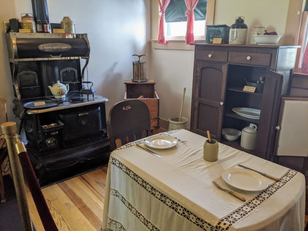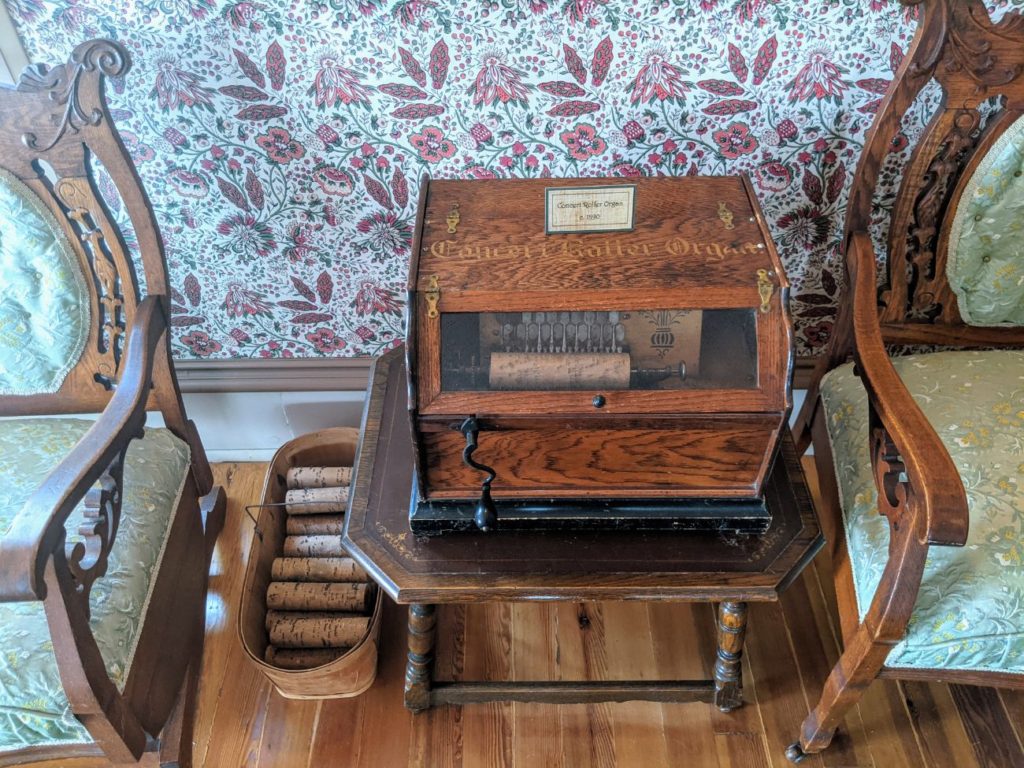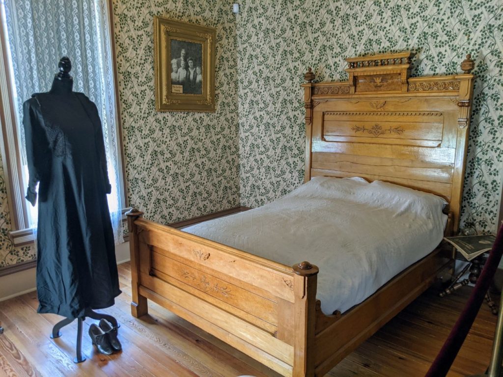Downstairs is a formal parlor with an elaborate music box and piano. You find Cody’s favorite chair, his office (with lots of rifles), and an absurdly small kitchen out back. My favorite detail is the dining room wallpaper. Cody had it commissioned to represent scenes from his shows, like stagecoaches, Indians, and Annie Oakley with her rifle.