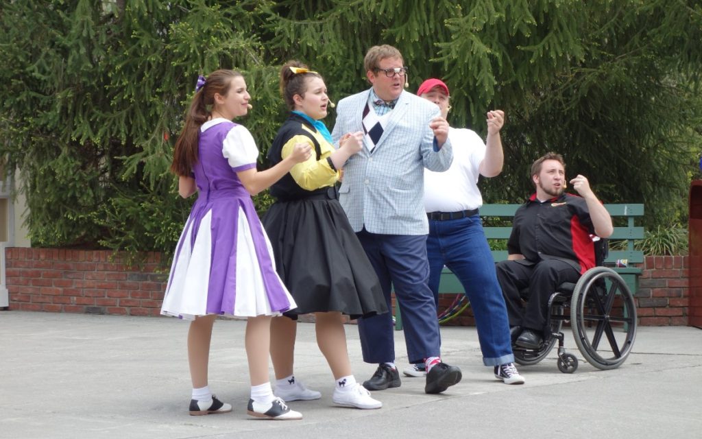 Dollywood’s regular entertainment includes Dreamland Drive-In, a surprisingly technologically advanced musical with excellent performers; the Gem Tones, a singing comedy street act; Live at the Back Porch featuring more contemporary music; the supremely talented Smoky Mountain String Band, and Country Crossroads, a mildly entertaining country music show with 6 color-coded singers.
