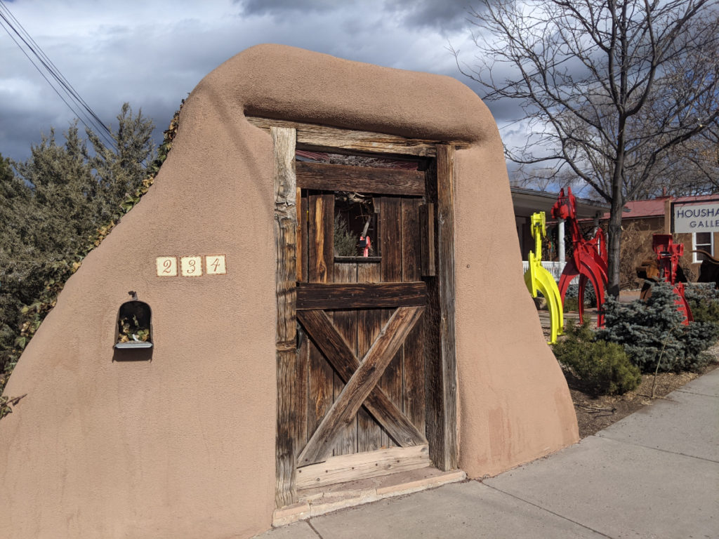 Beautiful curved door to the Two Graces shop in Taos – book and trinkets, super unique!
