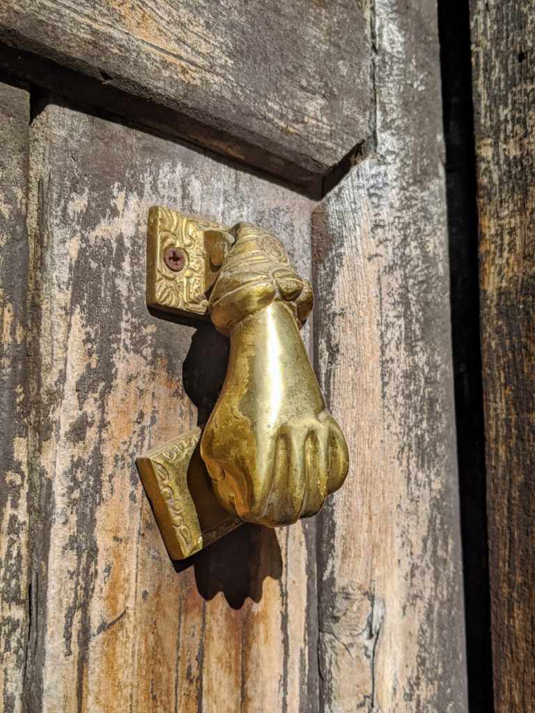 A hand-shaped door-knocker on Canyon Road