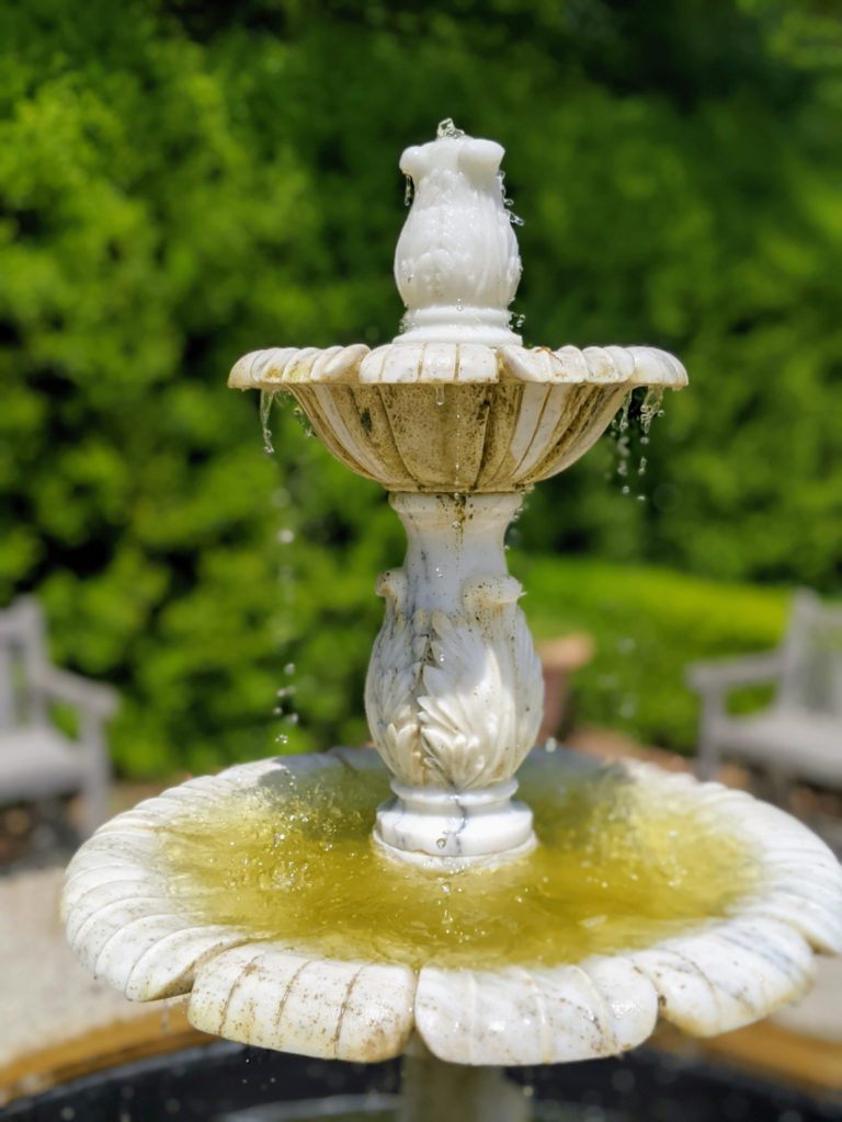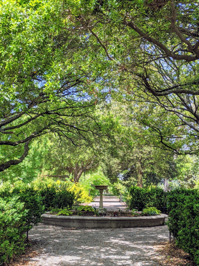 The area to the left of the house (as facing) is a beautiful grove of live oak trees, all planted around the ’80s and still huge! In the middle is a fountain, perfectly recreated from one that is original to the house. Underneath are purple hydrangeas, crepe myrtles, ferns, hostas, and more.