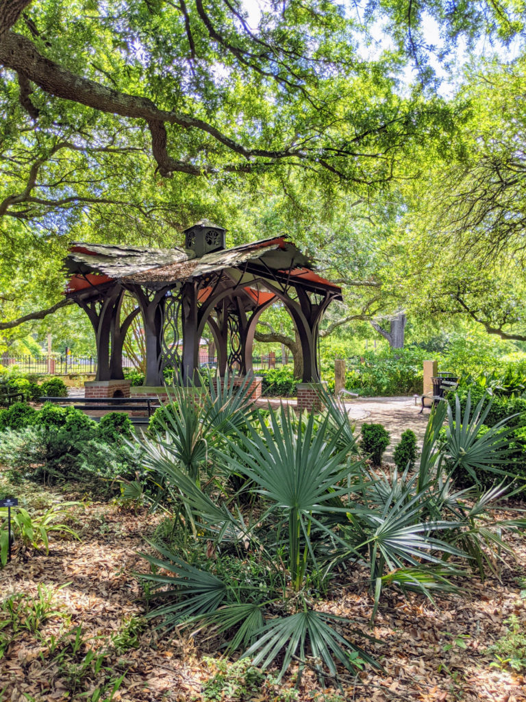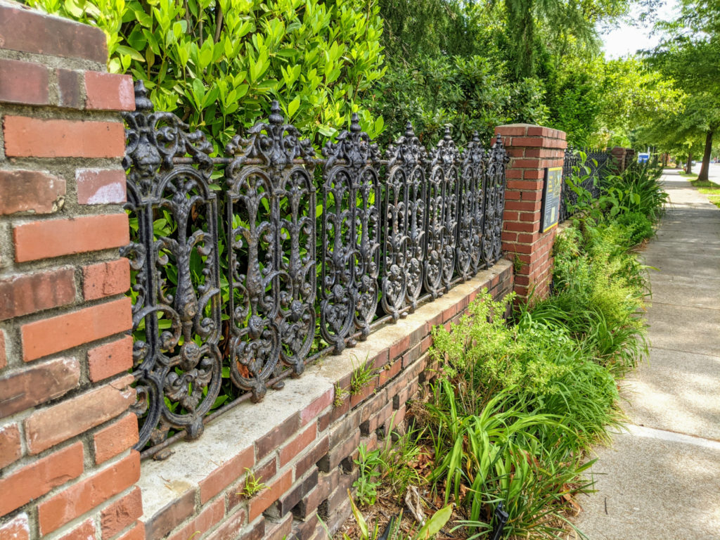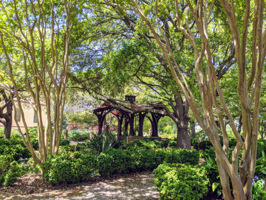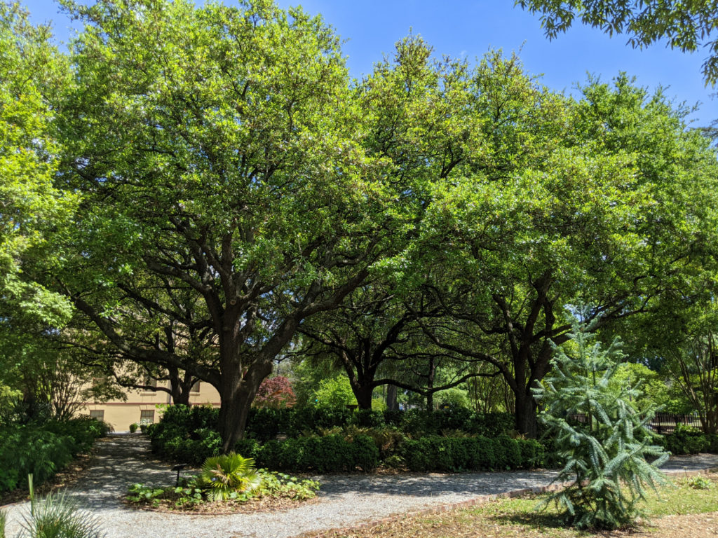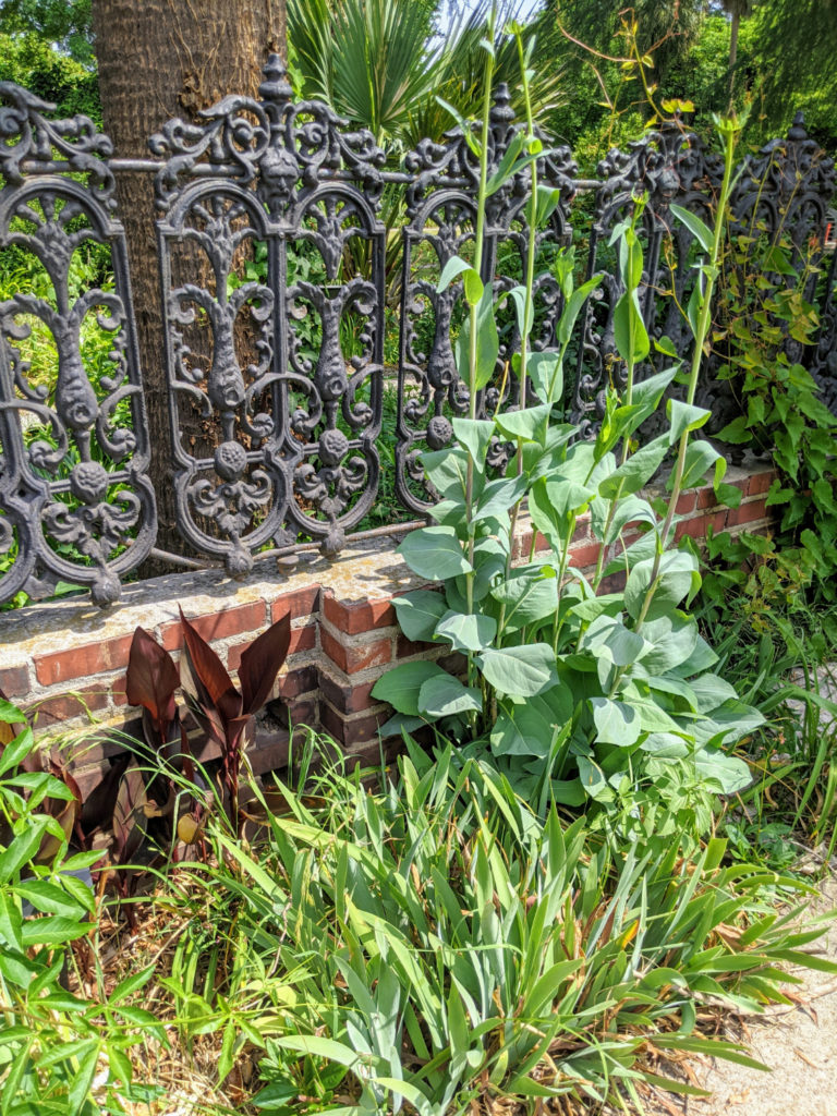 The gardens of the Hampton-Preston mansion are extensive and take up the whole block! The front gate and wall are somewhat original. The wall around the rest of the lot is more recent. The front welcome garden is also more or less original and showier, with exotic plants and full beds.