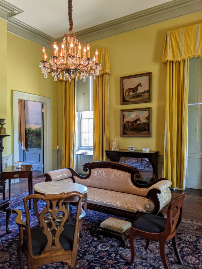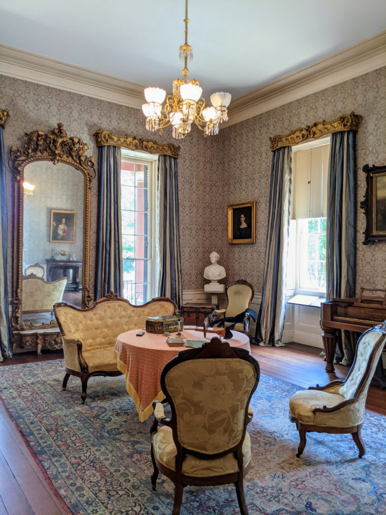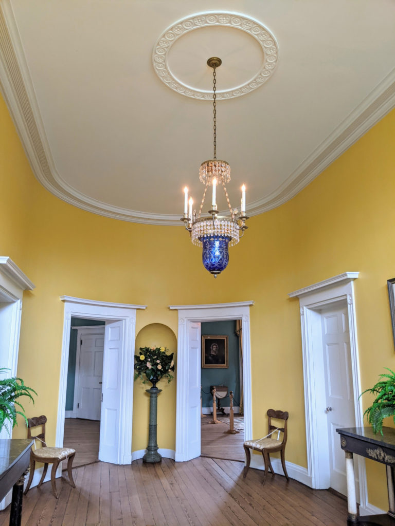 Now the house is furnished as a period family home. And it’s as if the family has just left, with food on the table and a concert about to begin. I find the front steps rather unimpressive – more like a D.C. monument and less like a grand southern home. But the front hall is stunning with curved walls and perfectly symmetrical doors (one of which is fake just for the symmetry!) Mills cared a lot about fire protection, so there’s no grand staircase – it’s tucked behind one of the doors.