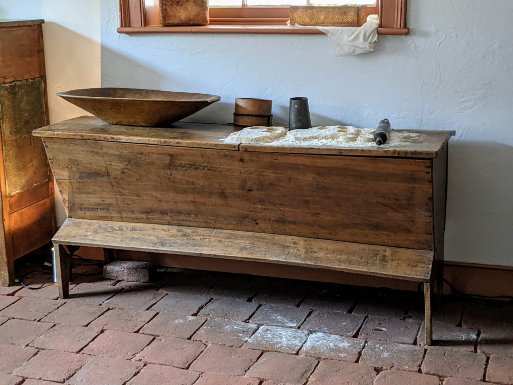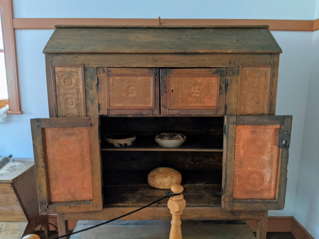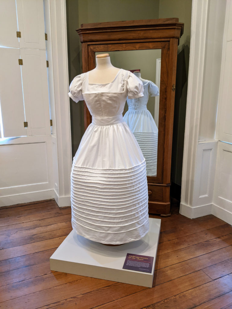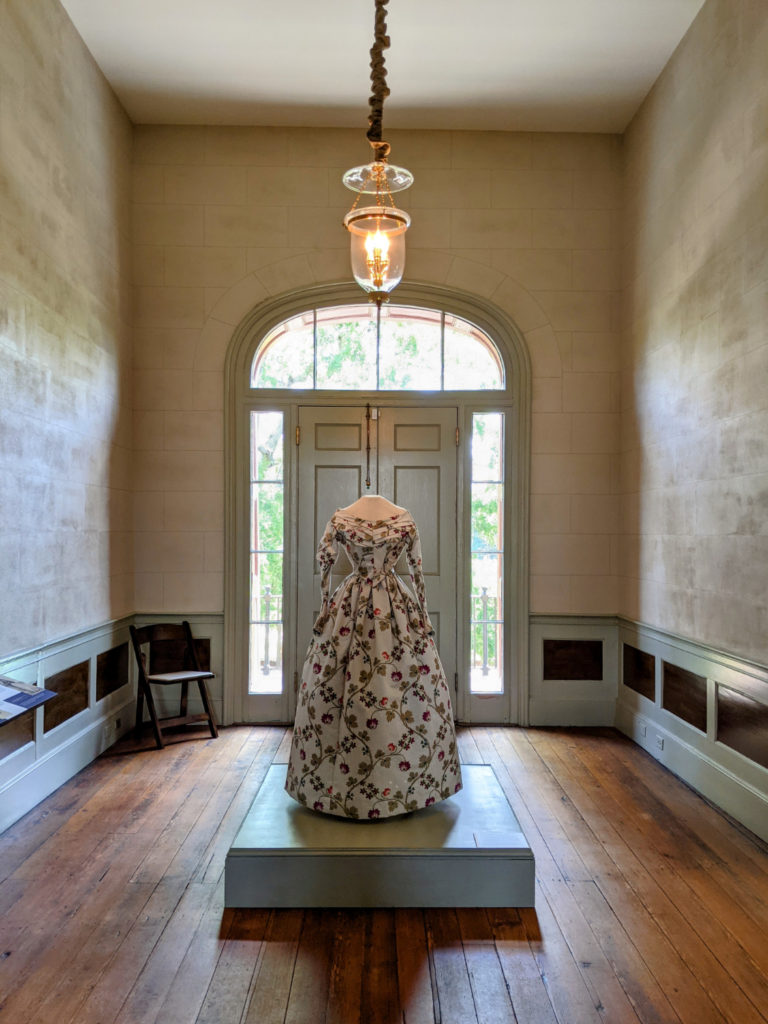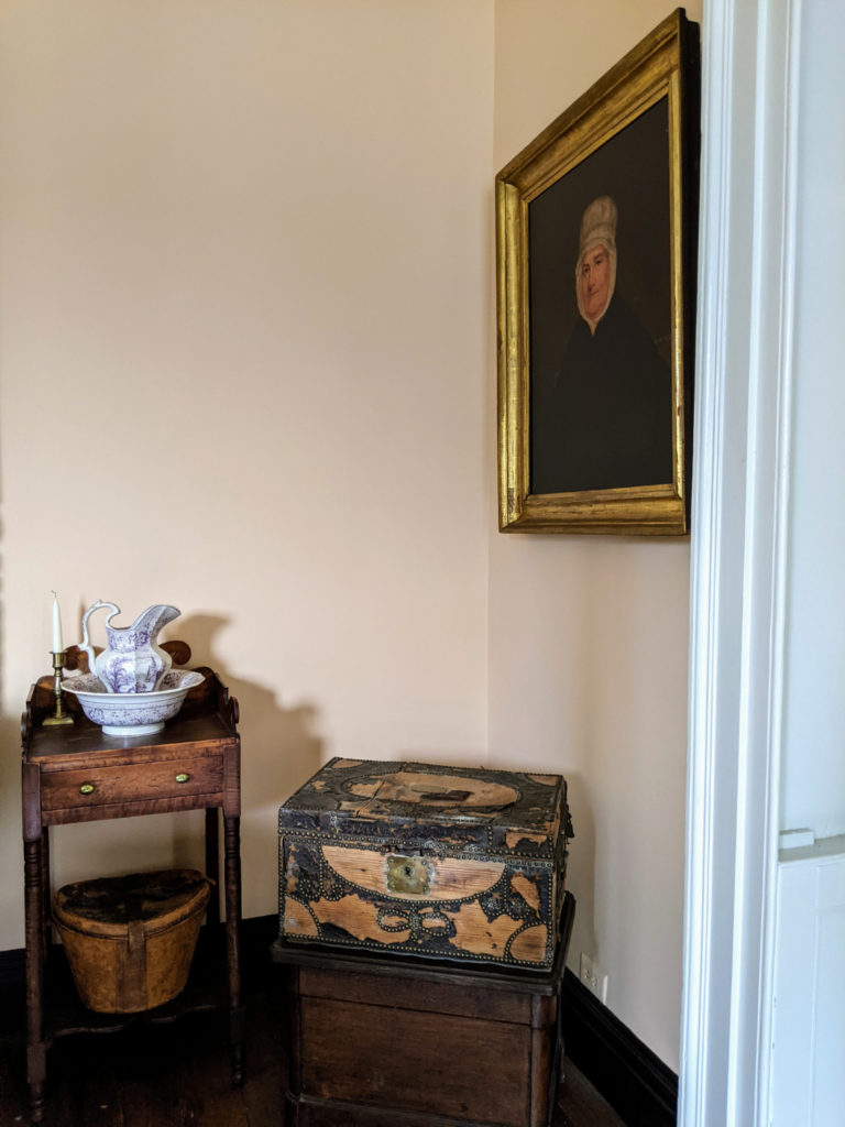 Upstairs is set up more like a museum. One room is furnished as a bedroom, with the oldest artifact from the original Hall family, a battered trunk by the bed. Other rooms display silver and household goods, and one room has a remade period dress with archival drawers holding the original pieces.