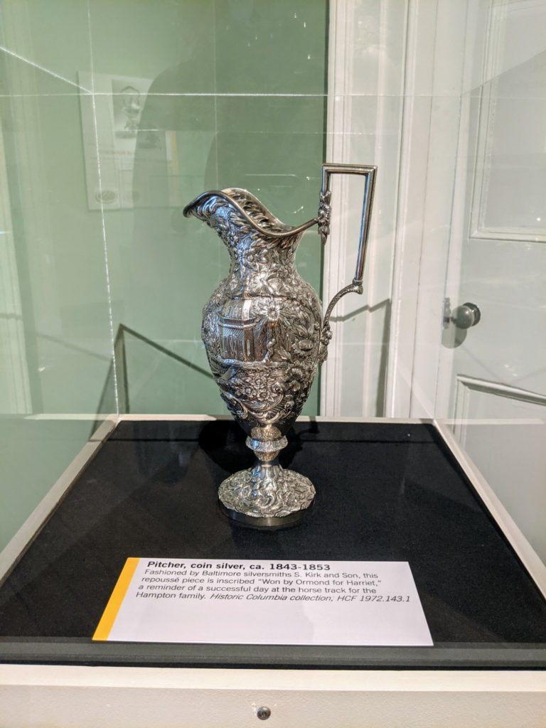 Downstairs, there’s a great touch screen with a hand-drawn map of what Columbia looked like, possibly from around this time – I’m not 100% sure the date of the map. But you can move the map around and see where buildings used to be or what was around the buildings that are still standing today. You can touch different sites to bring up more information about each place. Like the other houses, there’s a dress in the style of the era and a few period pieces.