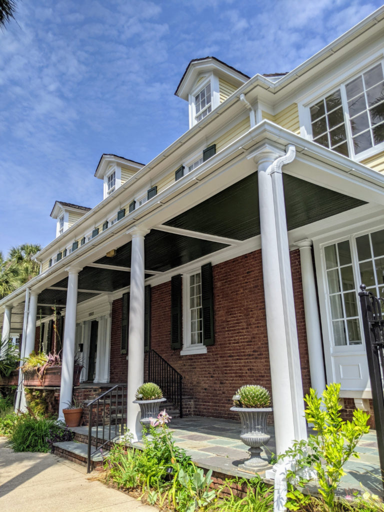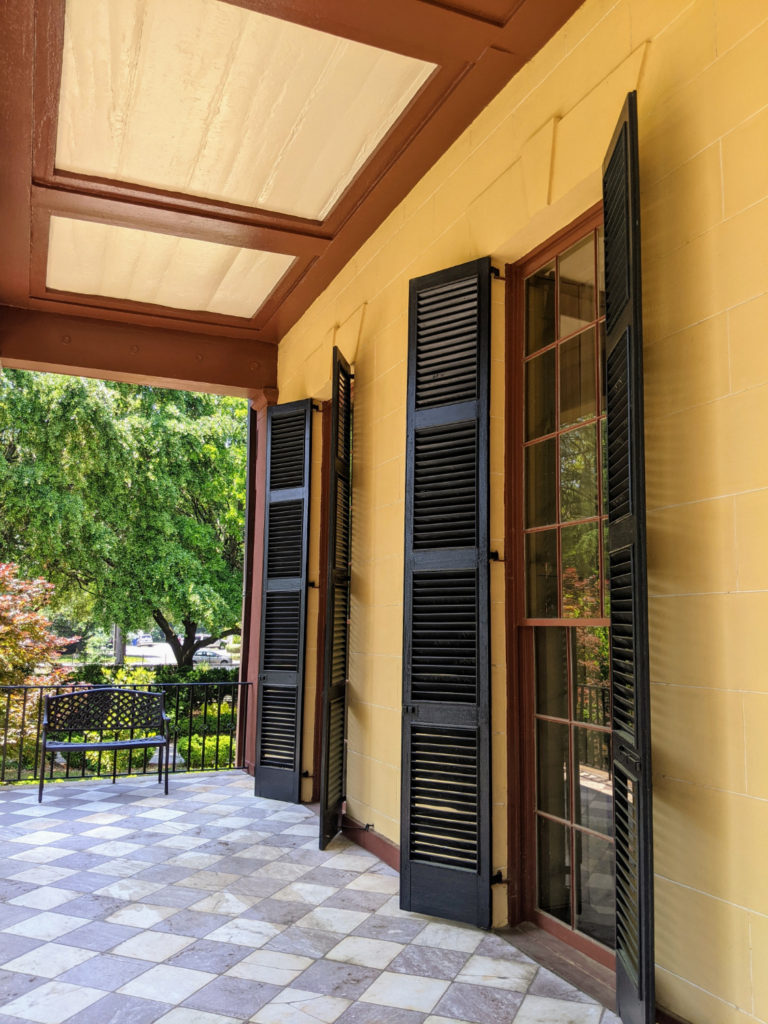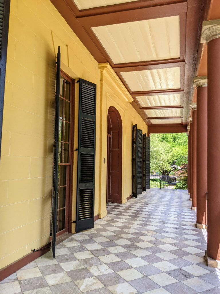 The front of the mansion has a much more grand facade than the Robert Mills House, with a long veranda and front staircase (though the stairs used to be on the ends, not the front.) A checkered marble floor leads to a grand entry hall, covered in a checkerboard custom linoleum.