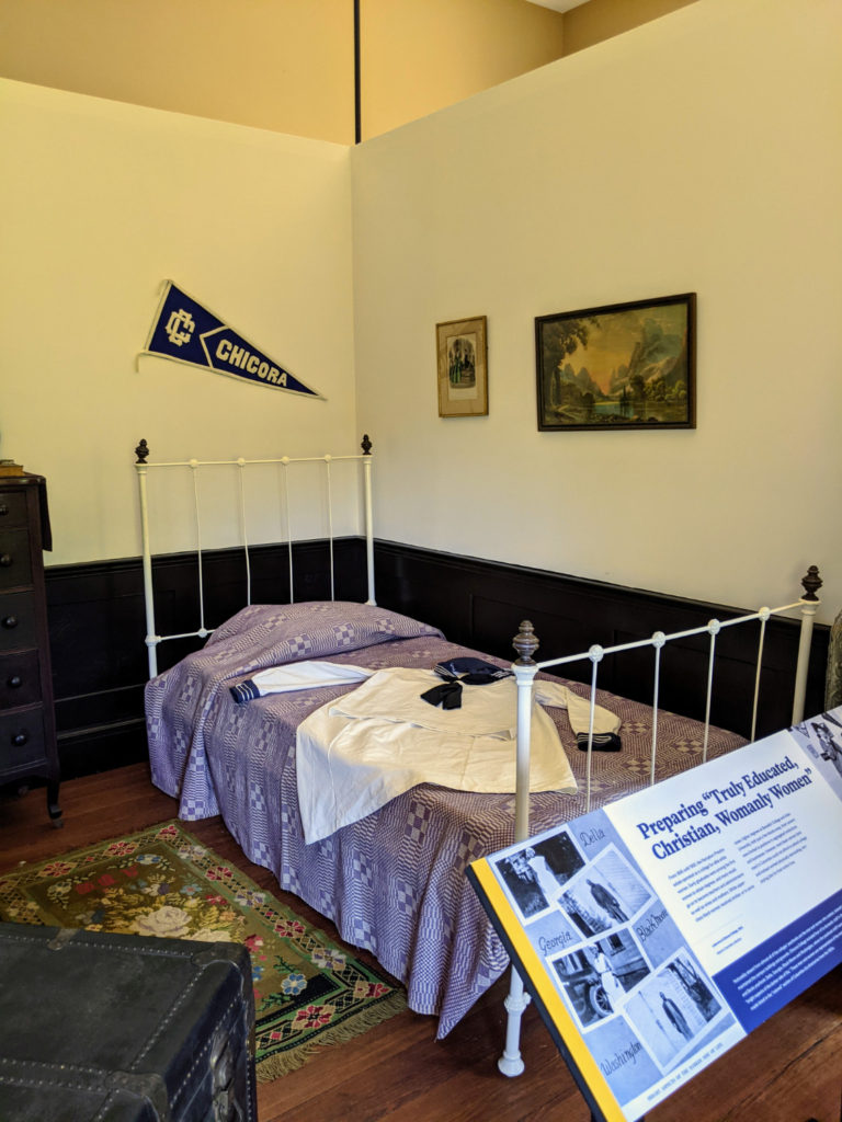 Upstairs is another beautiful period dress, and rooms are set up like the ladies’ school dorm rooms and a tourist home lounge. Photos on the walls honor notable Columbians.