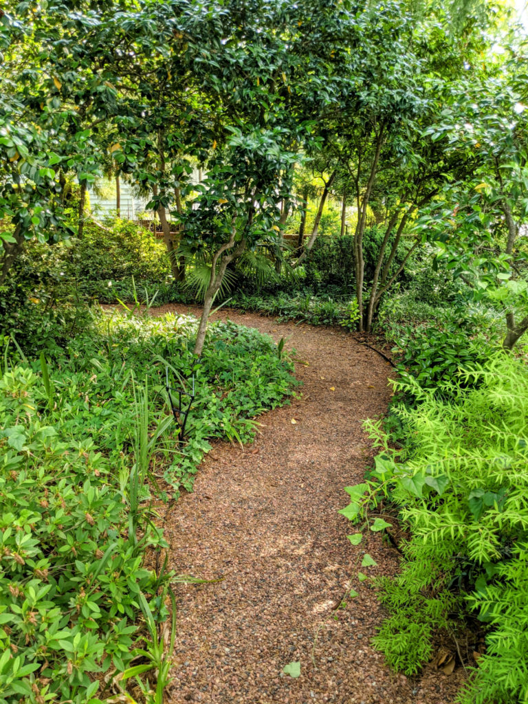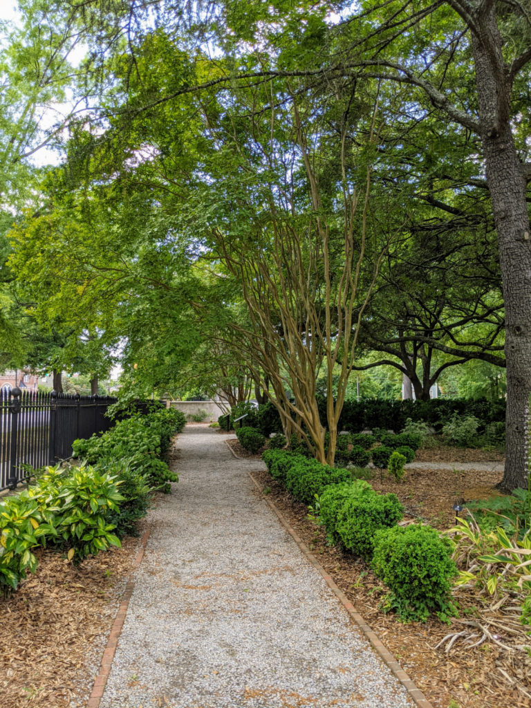 The front of the house (on Blanding) has a large, period-appropriate round gravel path. There are several large magnolia trees and a couple of interesting sweet gums – look for the super skinny one to the left as you face the house. As you pass under the arbor to the left of the house, notice the American varietal grapevines overhead.