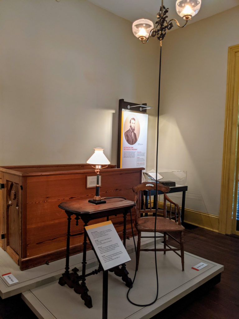 The Woodrow Wilson house is much smaller than the previous two mansions since it’s on par with a pastor’s salary. The house itself was built in 1871 and would be the only one the Wilsons ever own. It’s Victorian in style, with bay windows and a lattice front porch in pretty lavender and yellow tones. Inside is an entry hall with stairs and three rooms to tour. If I remember right, the room in the back was originally used as an office with an exterior door so students and parishioners could come and go without disturbing the rest of the house. That room now contains the Wilson family pew.