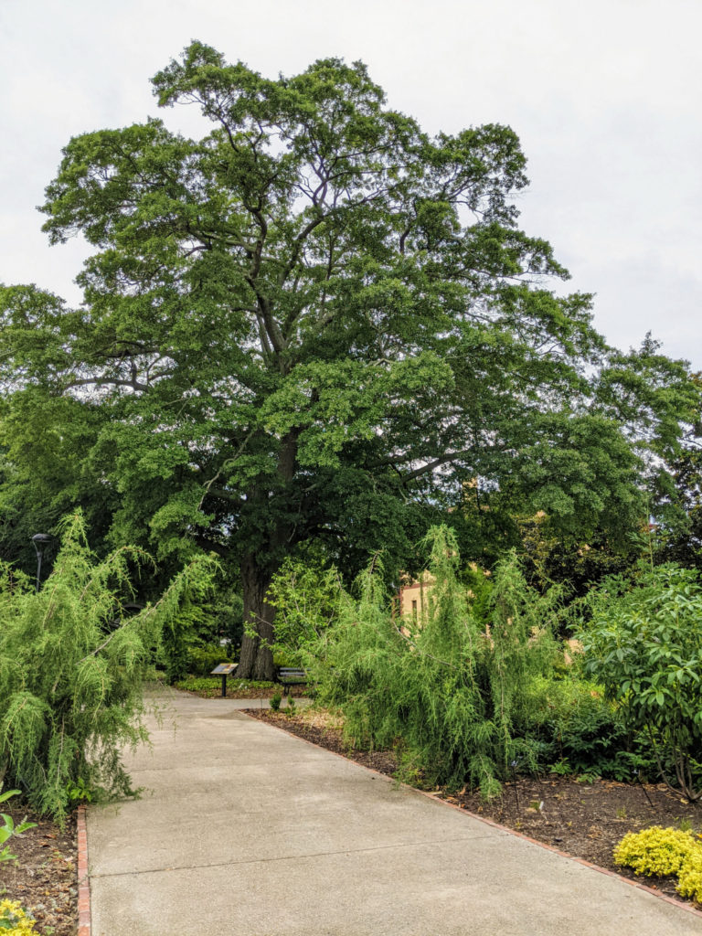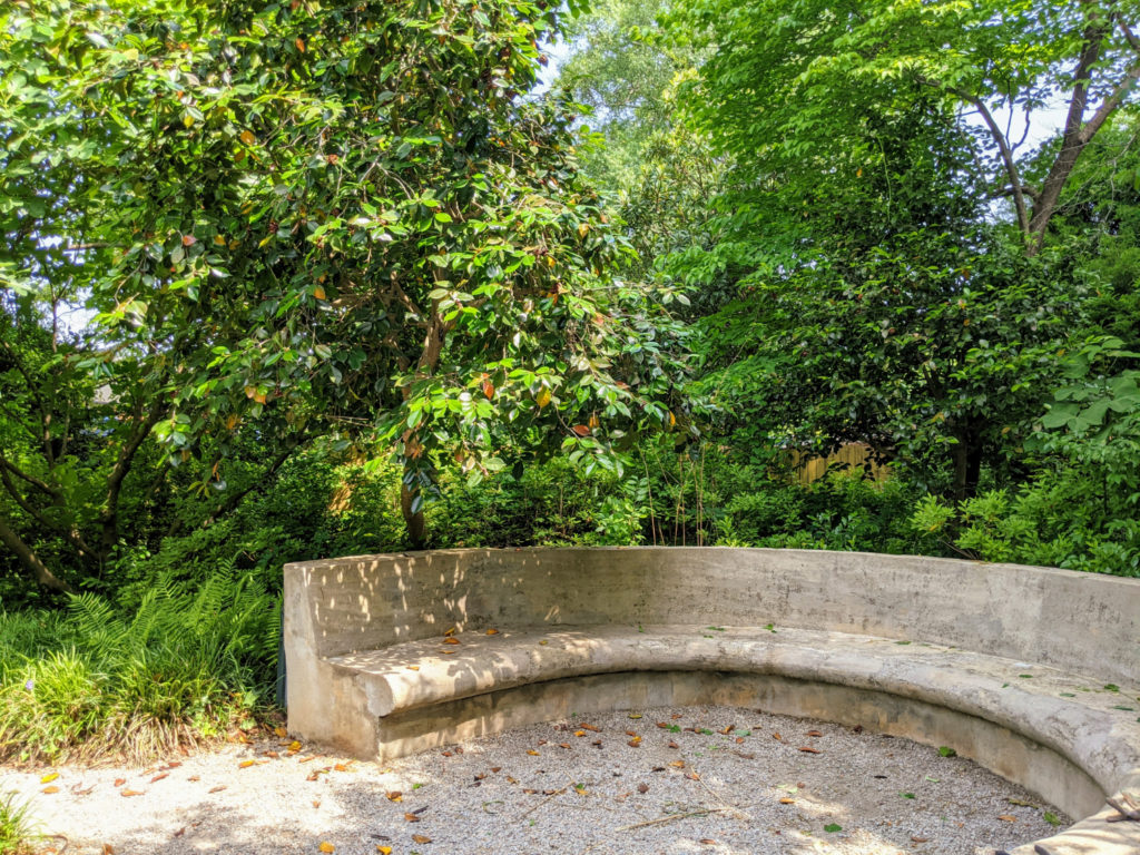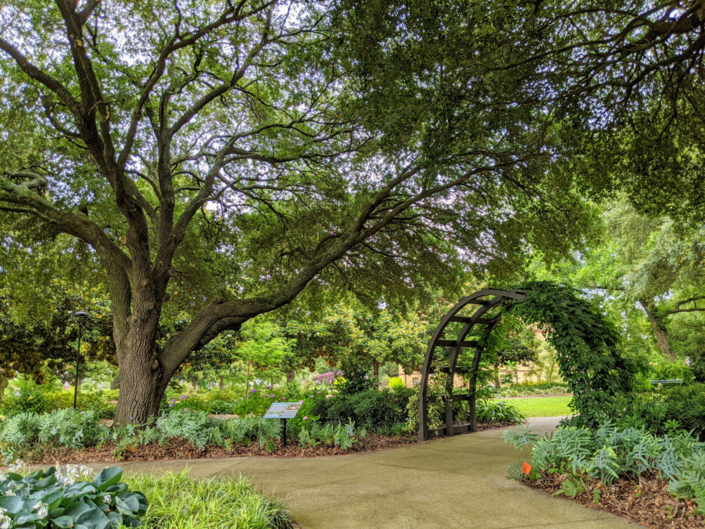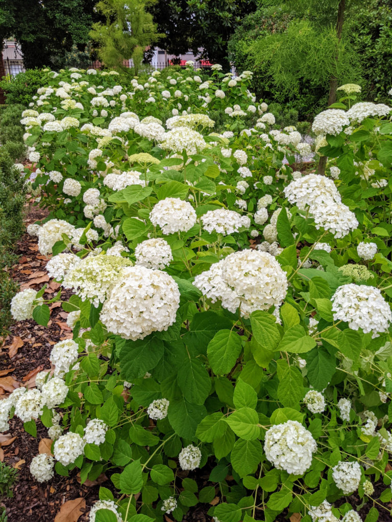 Behind the house (on Taylor) is a lawn with three huge magnolia trees flanked by beds of HUGE white hydrangea bushes. To the right is Founder’s Garden, a formal English garden with boxwood hedges and beds of native plants. A fountain in the middle provides a focal point, and a large elevated arbor with two climbing American wisteria vines will one day provide some shade. Quiet benches sit around the edges of the garden. The gardens are open most days of the week, so don’t be surprised to find a bride or a graduate having formal pictures taken during your visit.