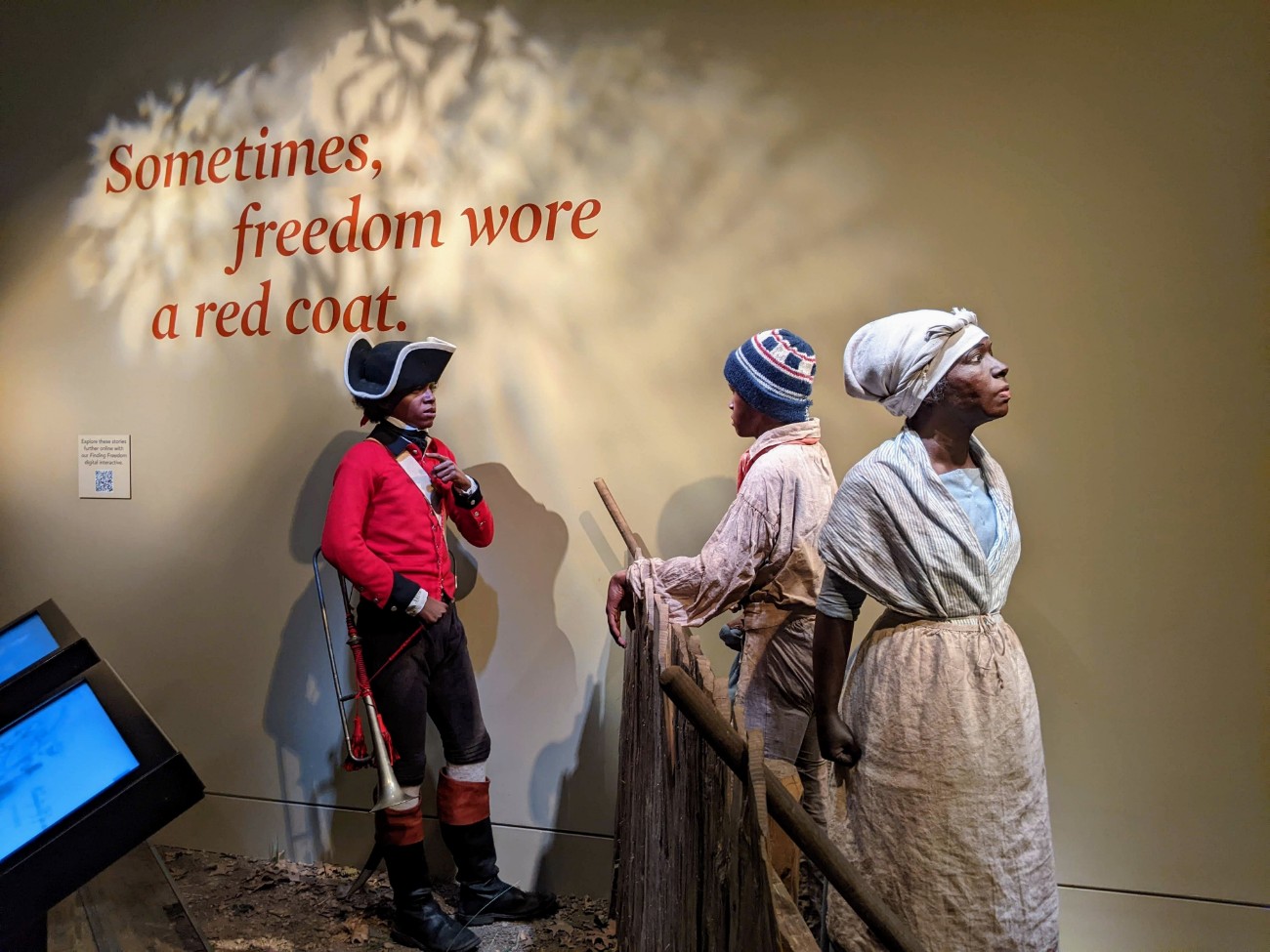 The Museum of the American Revolution opened pretty recently, in 2017. In fact, it opened on the 242nd anniversary of the first battles of that war, at Lexington and Concord. Many of the exhibits are more theatrical in approach. There are several life-sized wax figure scenes, projections, and audio that make it a more immersive experience than your average museum.