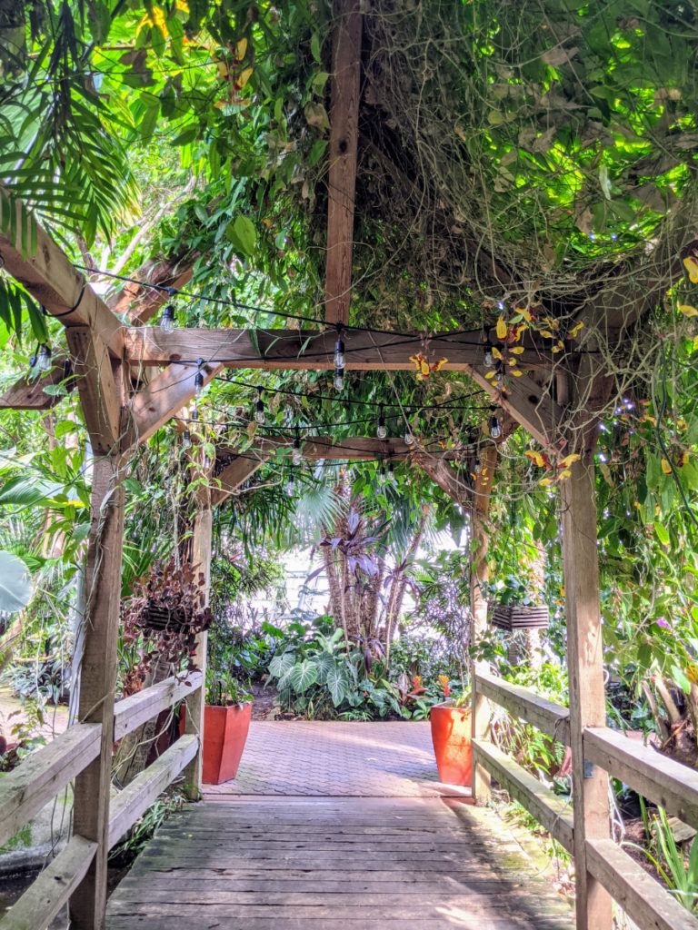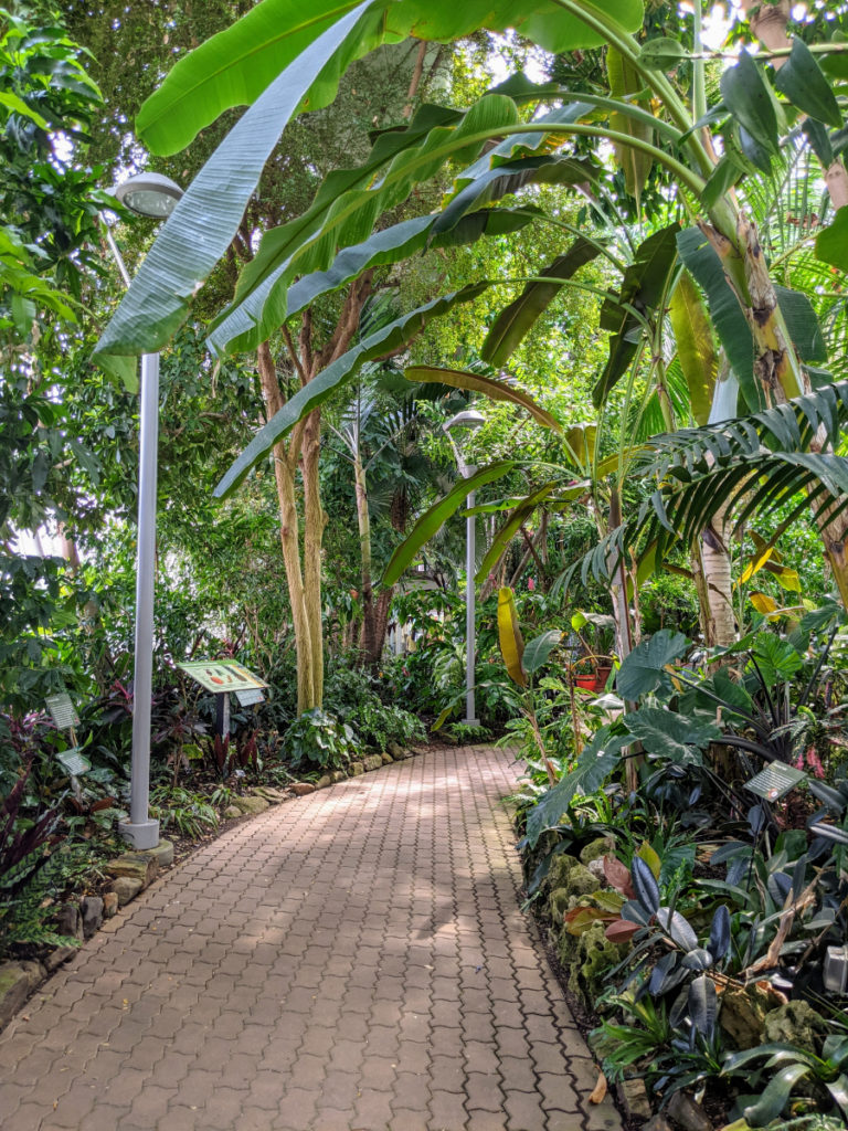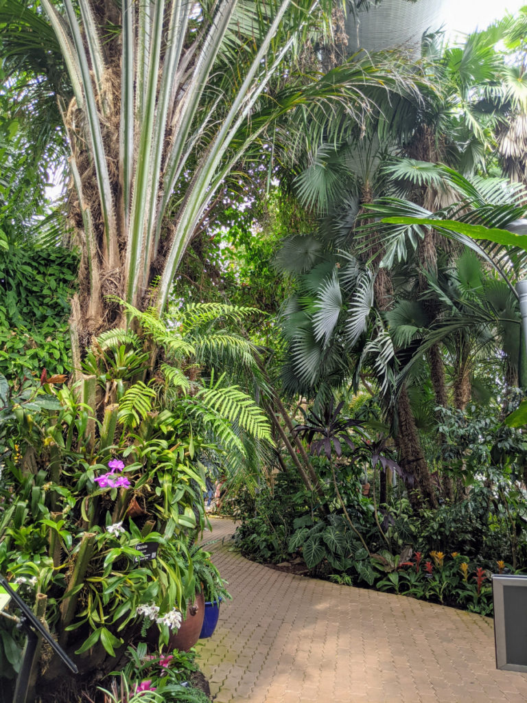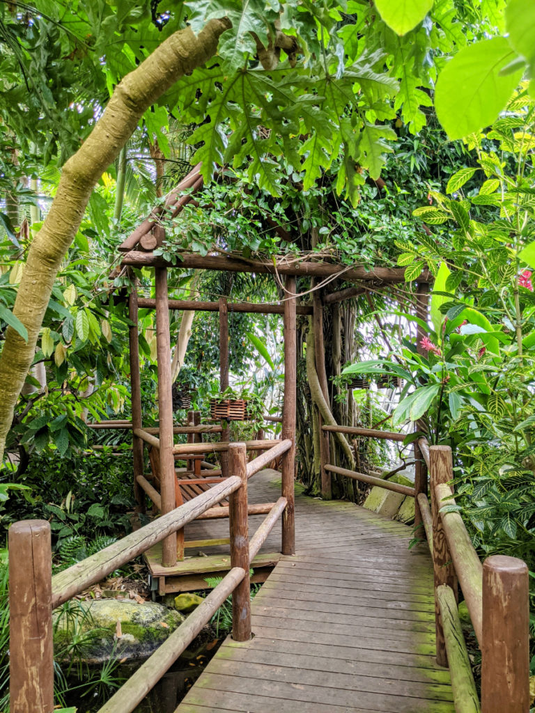 But the coolest thing about the conservatory is the sky bridge! There are stairs at each end leading up to a walkway the length of the Crystal Bridge so you can view everything from above. (And during Covid, they’ve made it one way.)