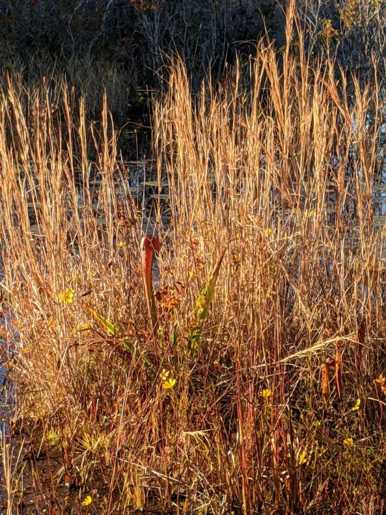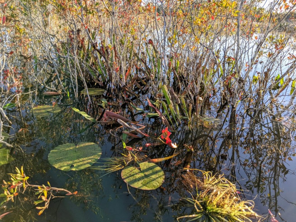 After a while, you turn left off the canal toward the Chesser Prairie. (In a swamp, a “prairie” looks like a wide, shallow lake.) We saw several birds out in these open spaces, learned about bladderwort plants, and saw carnivorous pitcher plants in the wild.