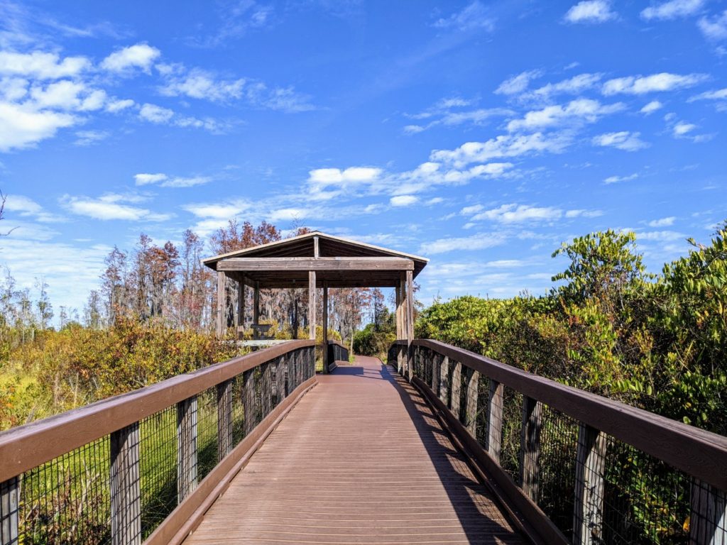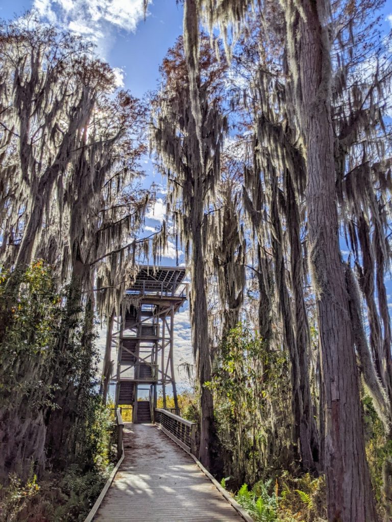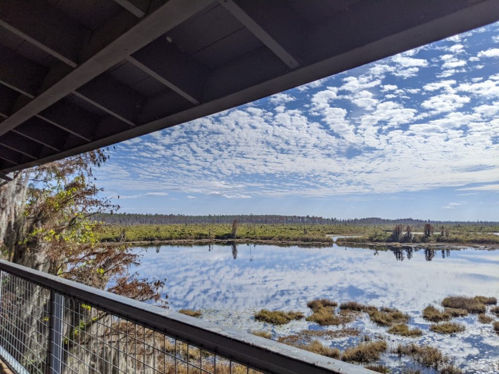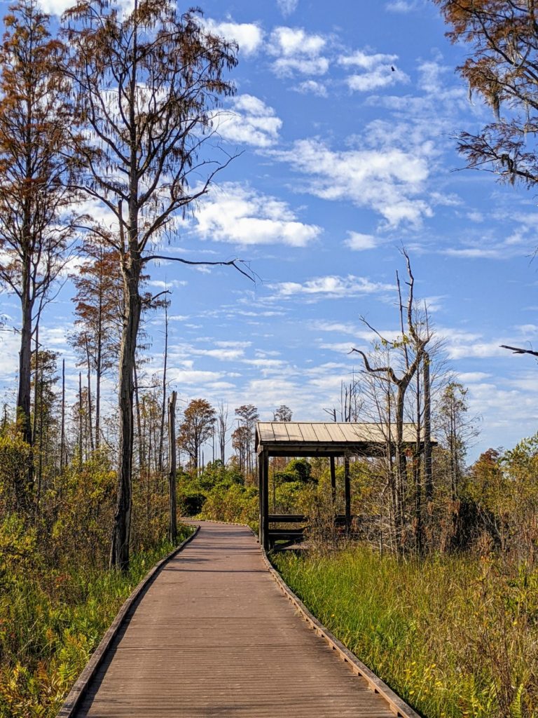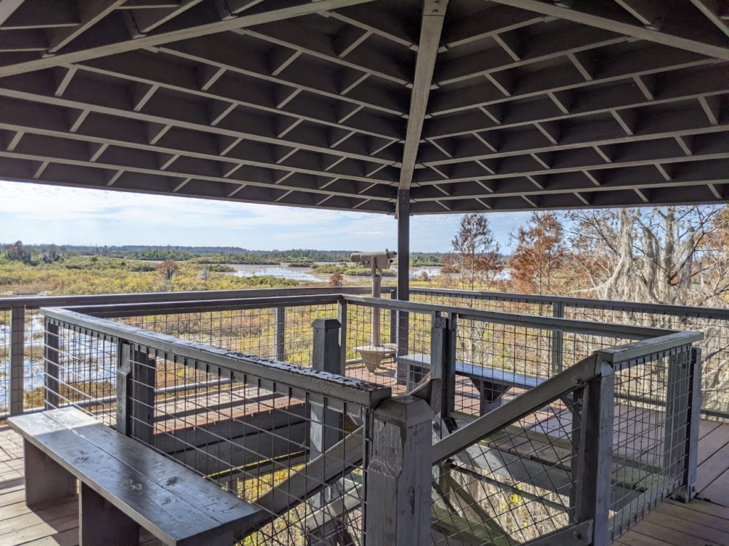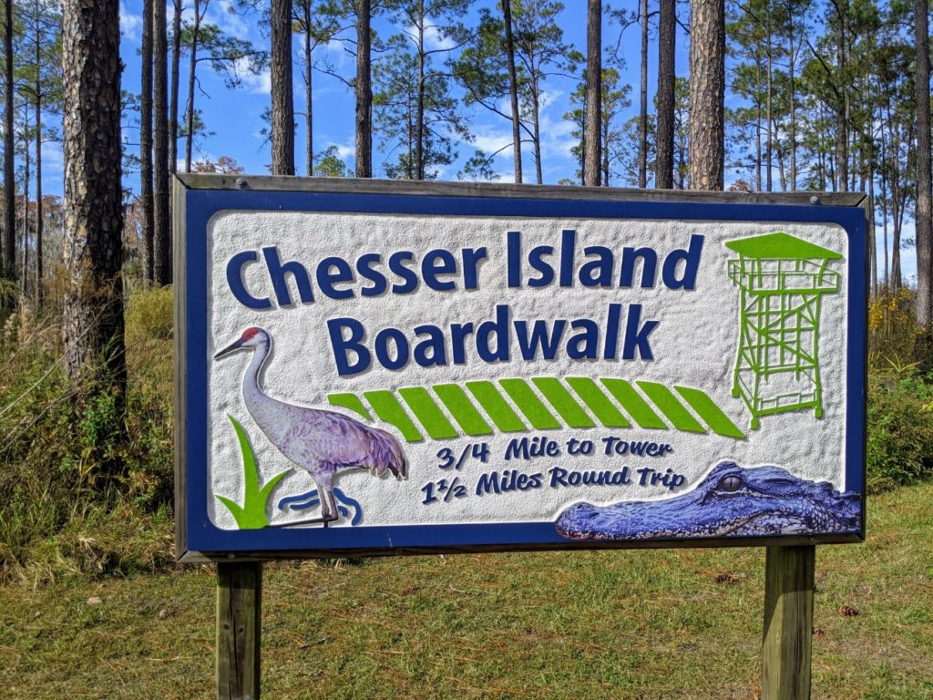 The last stop on Swamp Island Drive is the Chesser Island Boardwalk, a .75-mile walk out to the Owl’s Roost Tower for a view of the swamp prairie. There is a beautiful stand of Cypress trees at the entrance and more trees around the tower, but for the most part, it’s full in the sun, so make sure to wear sunscreen and/or a hat. There are three covered shelters along the way to rest.
