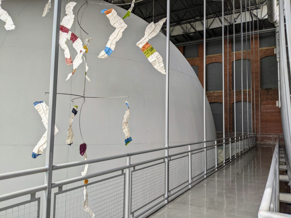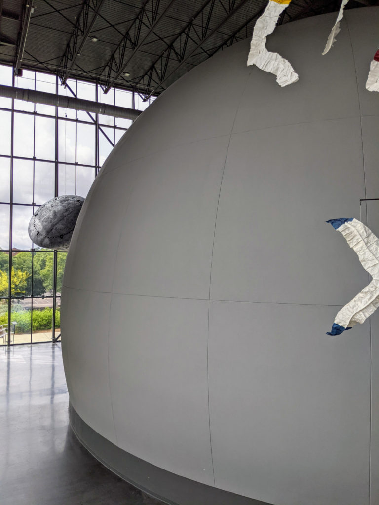 The Carolina Gallery really serves at the hallway to the planetarium, a concrete sphere housed in a glass extension outside the original mill walls. Feel free to walk around the perimeter of the dome – you’ll see a NASA landing shuttle and an art mobile. But to get to your show the quickest, head to the left from the door.