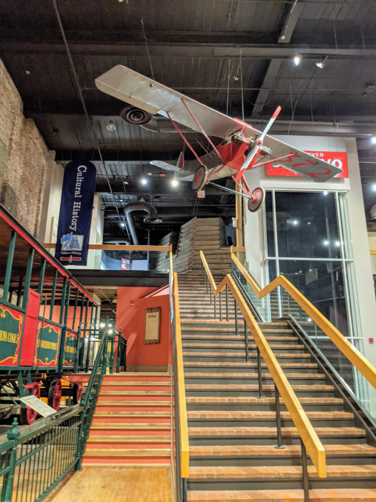 The 2nd-4th floors sort of nest together in this wing of the building. Stairs under the megalodon lead up to the third floor, and you can head straight to keep going to the fourth. The third floor is dedicated to technology and science. On this floor is a section on transportation, with a recreation of the Best Friend of Charleston, America’s first steam train. Hanging above the stairs to the fourth floor is South Carolina’s first monoplane, built by students inspired by the Wright Brothers.