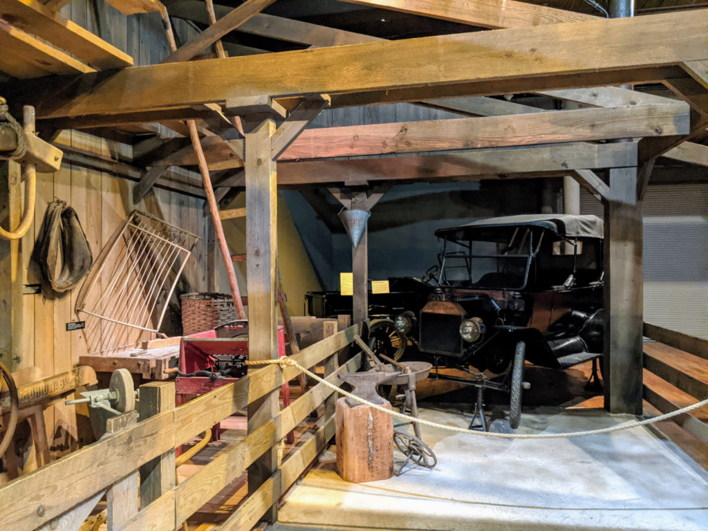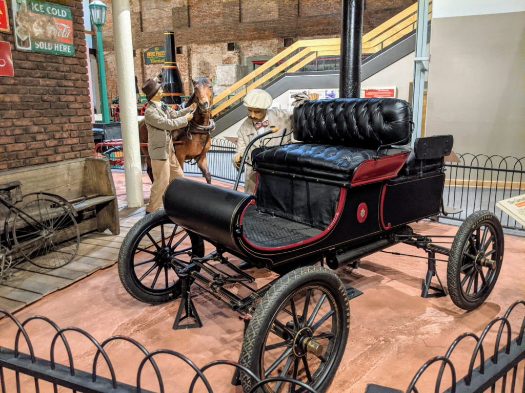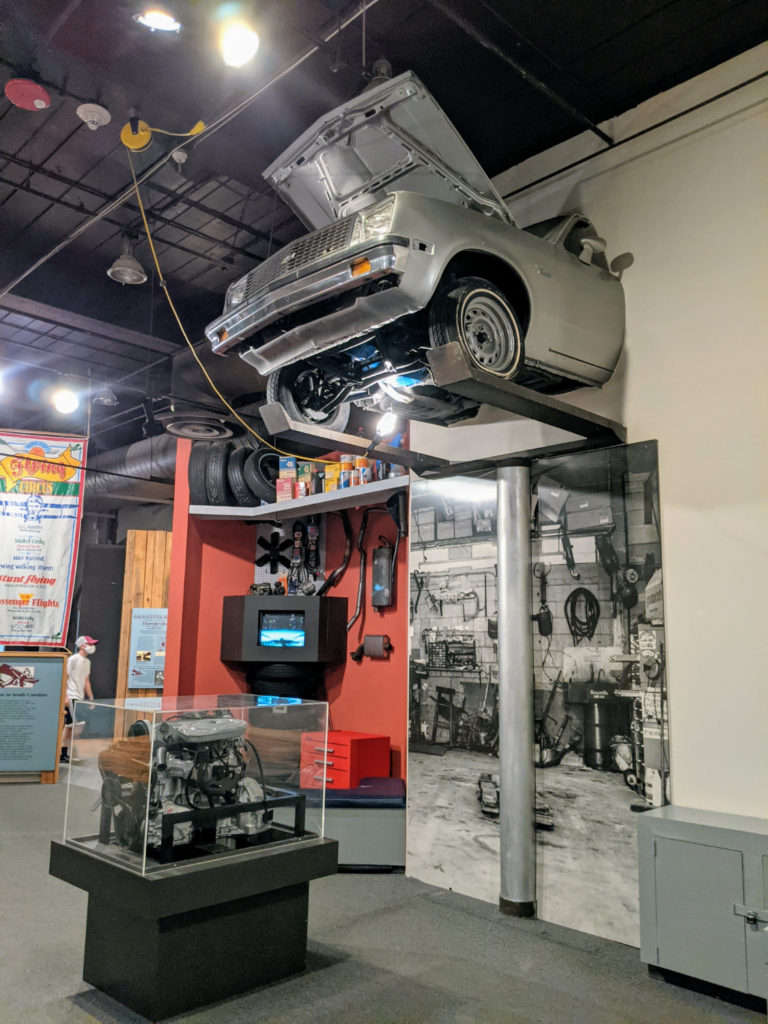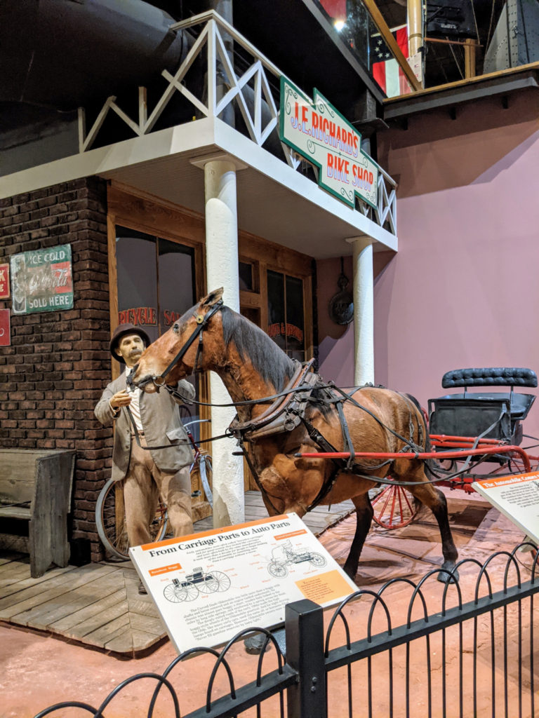 A scene in the middle of the floor depicts a horse and buggy shying away from a “new-fangled” horseless carriage. And surrounding this are other examples of early cars and wagons. Around the corner is a more modern auto shop with a seriously cute video about car advertisements. It gives me old-school Epcot World of Motion vibes.