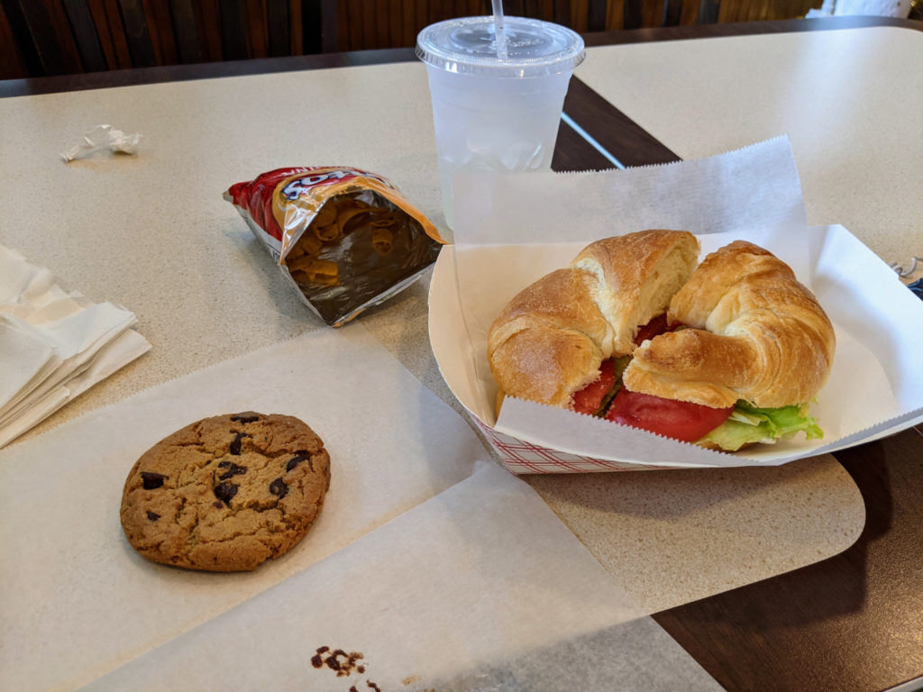 The cafe is pretty nice. I had a chicken salad croissant combo which includes a drink, chips, and a cookie for about $8. I could have got the chicken salad as a sandwich or a wrap, and there are other options like ham & swiss or grilled cheese, sort of normal lunch stuff. They also have snacks like pretzels, brownies, muffins, candy bars, stuff like that. The cafe is open from 11-2, and you can also leave for lunch and come back.