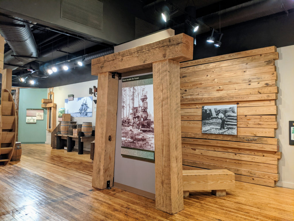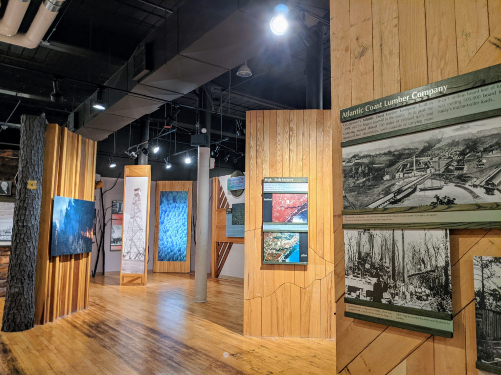 Past a barn with early wagons and tractors is a wood-paneled exhibit on forestry, forest industries, and management. A mini-movie talks about the history of logging in the area. (This museum’s mini-movie game is solid as well!) There’s a neat section on the Biltmore School of Forestry (ca. 1898 in Asheville, NC) and current attempts against deforestation. A display in the middle explains how the floors you are standing on were made.