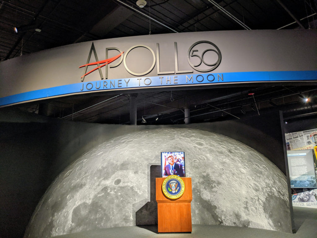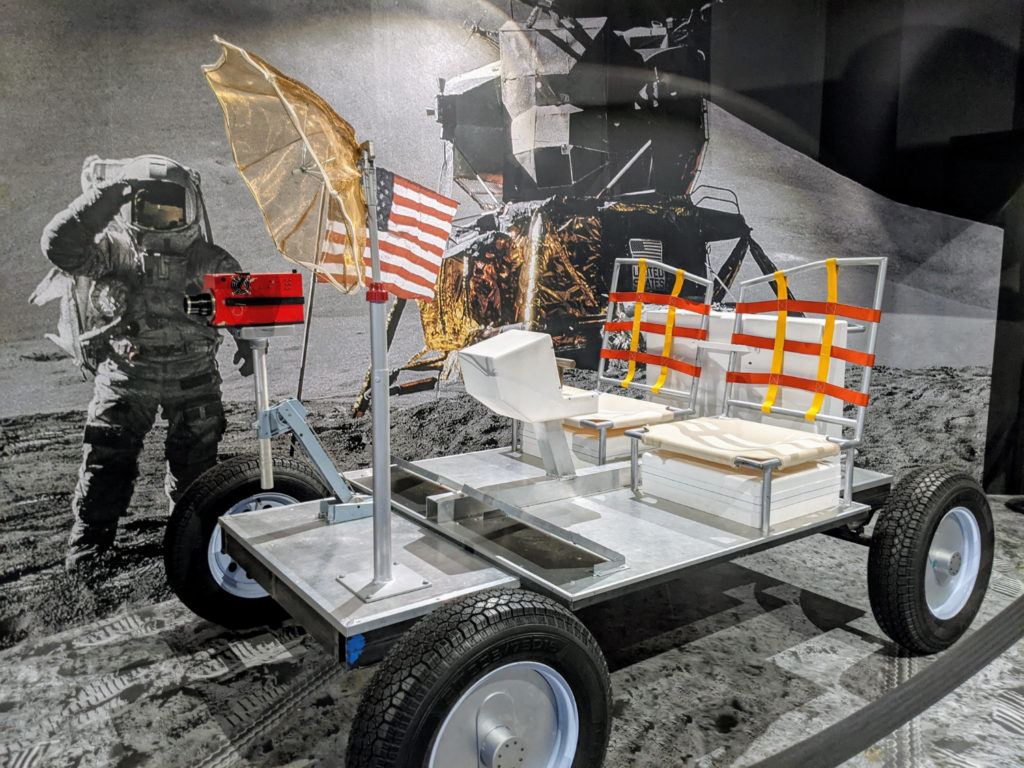 A section in the middle is about the space program and the moon landings, with a Mars rover and space suits.