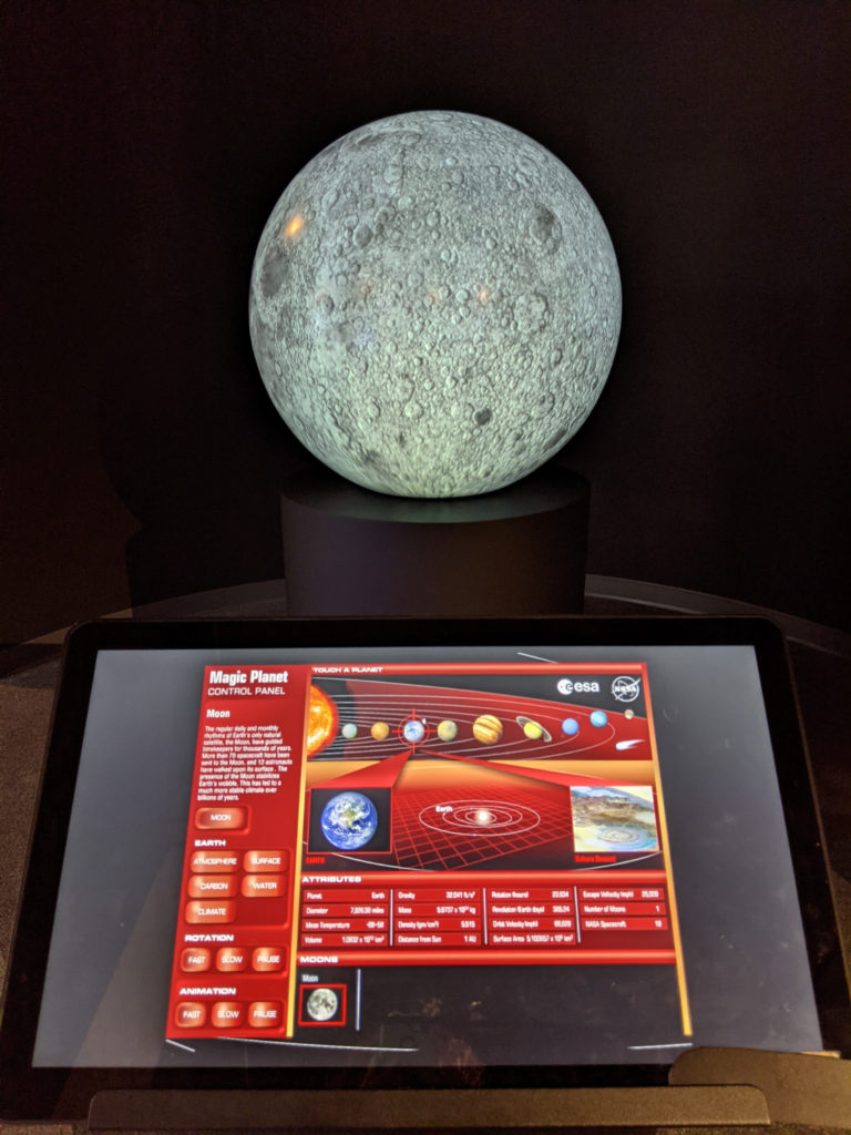 In this area is my favorite display, a “magic earth” globe you can change with an adjacent touch screen. You can make it look like any of the planets in the solar system (including Earth’s moon) using real photo imagery. For the Earth, there are five different versions for atmosphere, climate, etc.