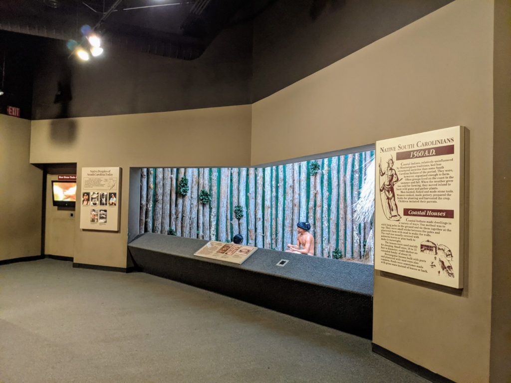 We get deeper into South Carolina cultural history on the fourth floor. Tucked behind the palmetto-log facade of Fort Moultrie are large and small dioramas of Native American cultures. Then we get into white exploration and settlement, leading into a section on the Revolutionary War.