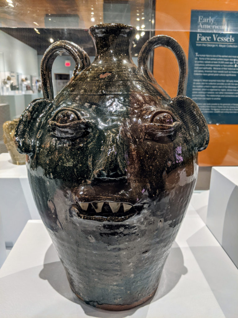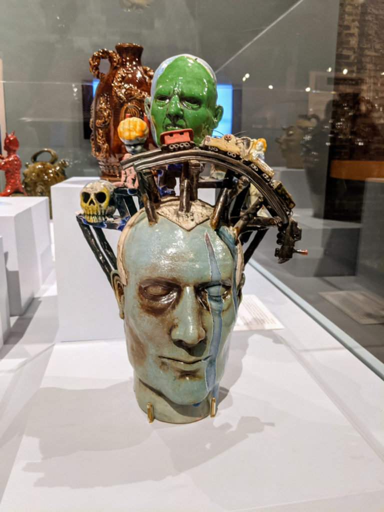 Behind the Standard Oil gas station is a space for a changing exhibit, currently about face jugs. Carolina pottery has a particular style and face jugs are a subset of that. And what ugly faces! They are made especially ugly in order to ward off evil spirits, tracing their roots back to African traditions.