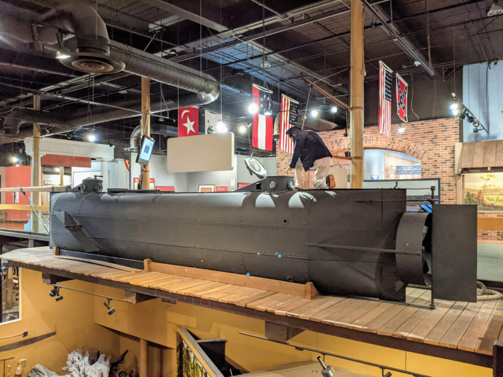 Then through a Fort Sumter-style arch is a section on the Civil War. At the stairs is a recreation of the Civil War submarine, the Hunley. (Operated with a hand crank, no less!) A model of an iron-sided steamship and a tiny David submersible illustrate the Confederate’s investment in innovation over volume as a naval tactic.